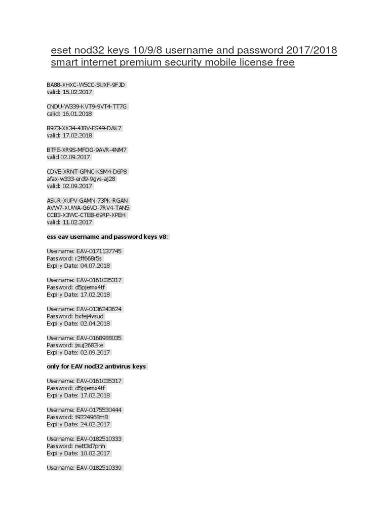 › eset-internet-securityEset Internet Security License Key 2022 Eset Nod32 Antivirus ... Feb 21, 2022 · Eset smart security username and password nod32 serial keys 8: username: eav 0188915190 password: f4m5v9dt3u expiry date: 16.01.2018 username: eav 0187809544 password: e35cn555jf expiry date: 04.01.2018 eset smart security premium 10 license keys vhg6 x5t4 6sk6 maba ead9 cutm xsj7 873k m8uc 5rc8 dx49 xka6 xdfn re6h 95d6 valid 04.08.2017 premium.